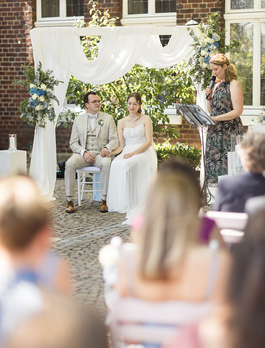 Vor den Toren von Münster liegt das kleine Schlösschen Haus Ruhr, dass den Flair eines englischen Landhauses ins Münsterland bringt. In dieser traumhaften Hochzeitslocation können Hochzeitspaare sowohl kirchlich in der kleinen Kapelle oder auch standesamtlich zum Beispiel im Rittersaal heiraten. Aber auch eine freie Trauung auf der Wiese vor der romantischen Orangerie ist eine Option. Bis in die Nacht gefeiert werden kann dort ebenfalls in einem der zwei Säle. Als Hochzeitsfotografin liebe ich die verwunschenen Wege entlang des Wassers, das elegante Herrenhaus und die kleinen Ecken, in denen sich besondere Momente einfangen lassen. Wer eine intime, naturnahe Hochzeit im Münsterland mit kurzen Wegen zwischen den Tagespunkten sucht, ist hier genau richtig.